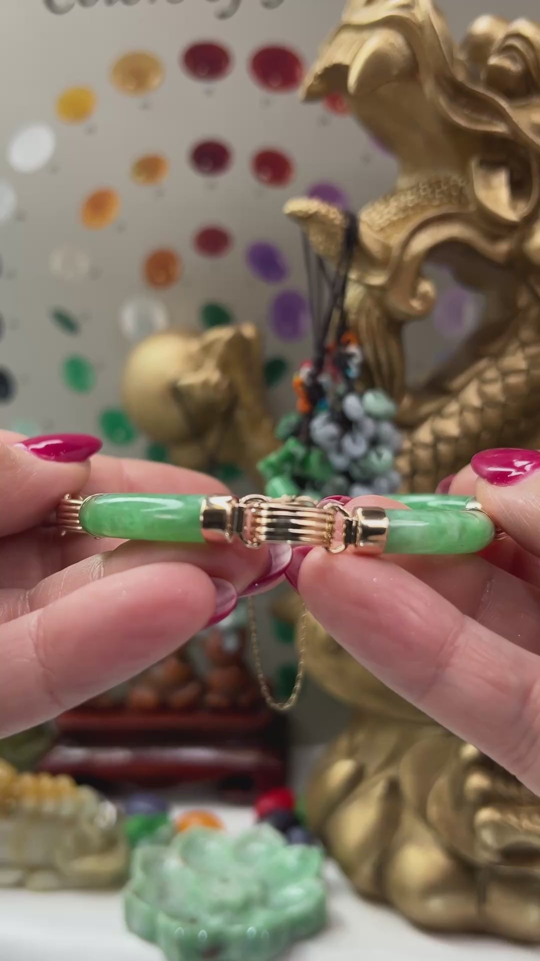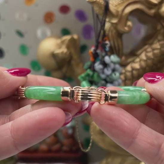 A refined blend of vintage aesthetics and everyday elegance, this jadeite jade bracelet features four curved green jade arched segments secured with 14K yellow gold caps and ribbed fluted spacers. The 7-inch length suits any wrist, making it an ideal choice for those who value genuine craftsmanship and the enduring appeal of natural stone jewelry.