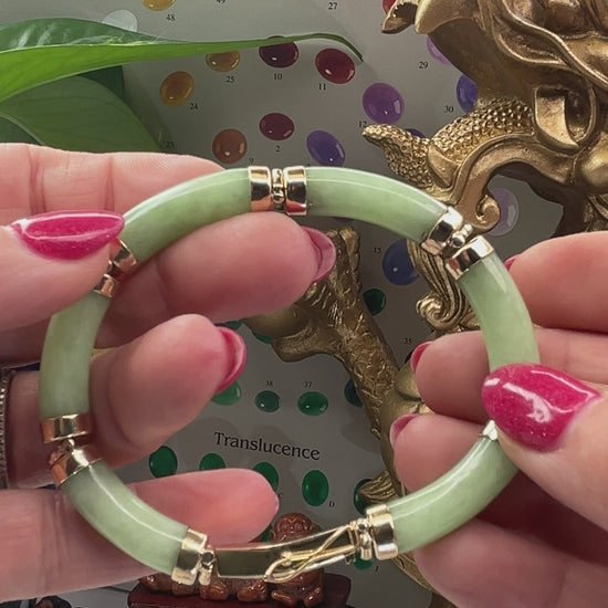 Elegant vintage design meets everyday versatility in this jadeite jade bracelet. Six arched green jade segments are anchored with 14K yellow gold caps and rivets, creating a timeless piece that works beautifully for any wrist. At 7 inches, it's the perfect length for both men and women seeking a refined accessory with authentic craftsmanship and natural stone appeal.