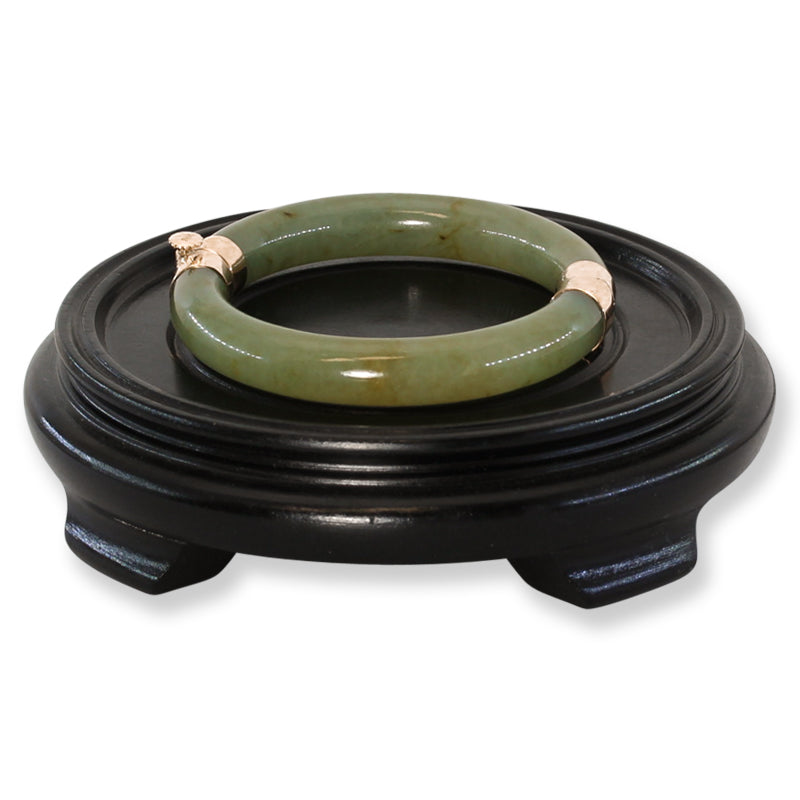 This vintage olive green semi-translucent hinged and clasp bangle will fit a wider range of bangle sizes than a traditional continuous bangle. The hinge-and-clasp makes it easy to take on and off, and your stone is protected by the screw in safety clasp to keep it from opening.