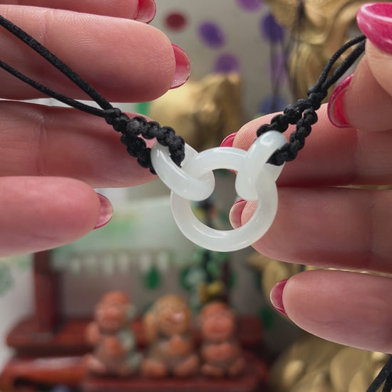 This necklace features three interlocking white jadeite jade rings suspended from a double cord adjustable necklace. Remarkably, all three rings were carved from a single piece of jade, showcasing exceptional craftsmanship and elegant design.