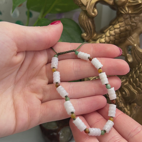 This fun white jade carved cylinder and rainbow round bead jade bracelet is on an adjustable silky cord. Perfect for small to medium wrists. Great gift for anyone. Mason-Kay gift wrap included. Genuine type A jade. Guaranteed!!