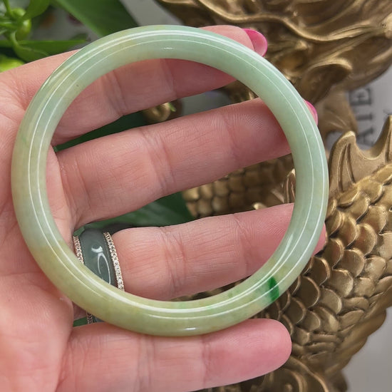 This natural jade bangle bracelet has natural yellow and green jade color. Our jadeite jade is natural, meaning it has NO dyes and NO polymer-impregnation. Some of our pieces may have a thin coating of beeswax to protect the surface of the jade. This does not affect the appearance or value of the stone.