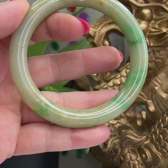 This natural jade bangle bracelet has natural green and yellow jade color. Our jadeite jade is natural, meaning it has NO dyes and NO polymer-impregnation. Some of our pieces may have a thin coating of beeswax to protect the surface of the jade. This does not affect the appearance or value of the stone.
