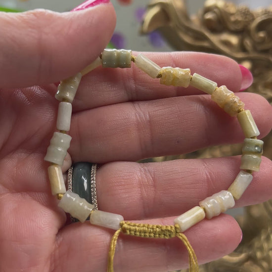This authentic unisex jade bracelet comes on an adjustable bonded nylon cord and is a part of our Classic Jade Collection. This jade stone has natural yellow color and is guaranteed free of dyes and resin/polymer-impregnation.