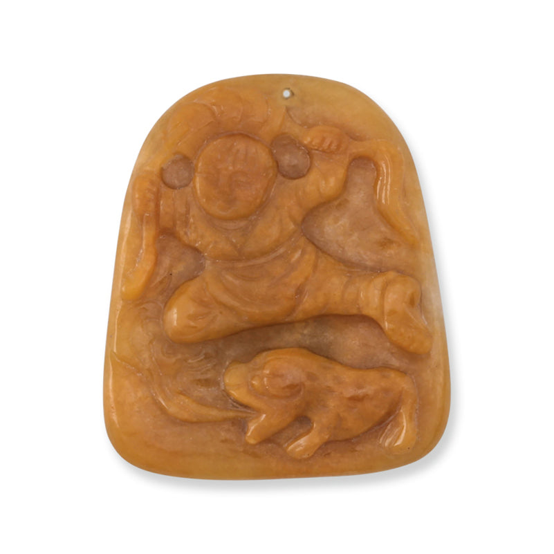 Hand-carved yellow jadeite jade boy jumping with coins on a rope over a pig carving. Coins and pig represent prosperity and wealth. The pig is the 12th sign in the Chinese zodiac chart.